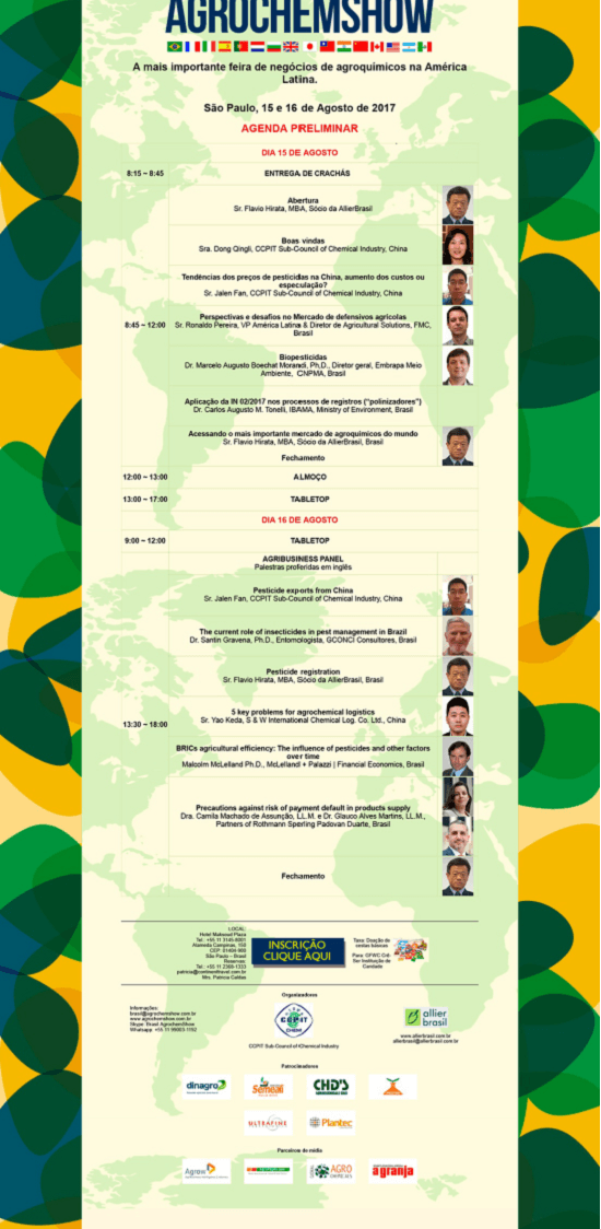 Estamos próximos ao 10° Brasil AgrochemShow a ser realizado em São Paulo nos dias 15 e 16 de agosto. Estão previstos mais de 300 visitantes e expositores da China, Índia, América Latina, Brasil.