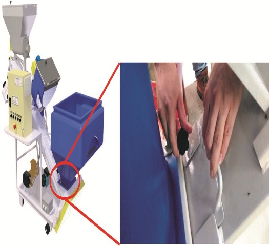 Para calibrar a vazão de sementes, o operador deve encher a moega de abastecimento, aguardar o fluxo de sementes tornar-se contínuo na saída da máquina e cronometrar durante um minuto quantos quilos de semente passam pela máquina numa abertura fixa da guilhotina. O valor encontrado será a vazão por minuto da máquina para aquela abertura (para descobrir o valor em horas, basta multiplicá-lo por 60).