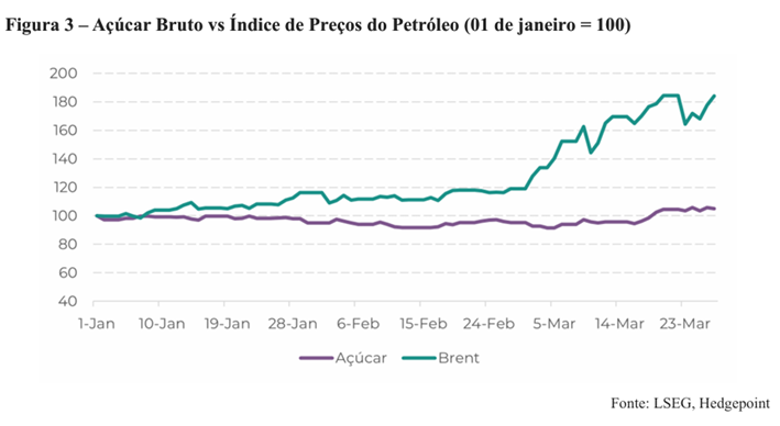 Por outro lado, a continuidade desse suporte depende da evolução do cenário externo. Em caso de redução das tensões geopolíticas ou limitação no repasse de custos no mercado doméstico, os preços tendem a corrigir, refletindo novamente os fundamentos de oferta mais abundante.