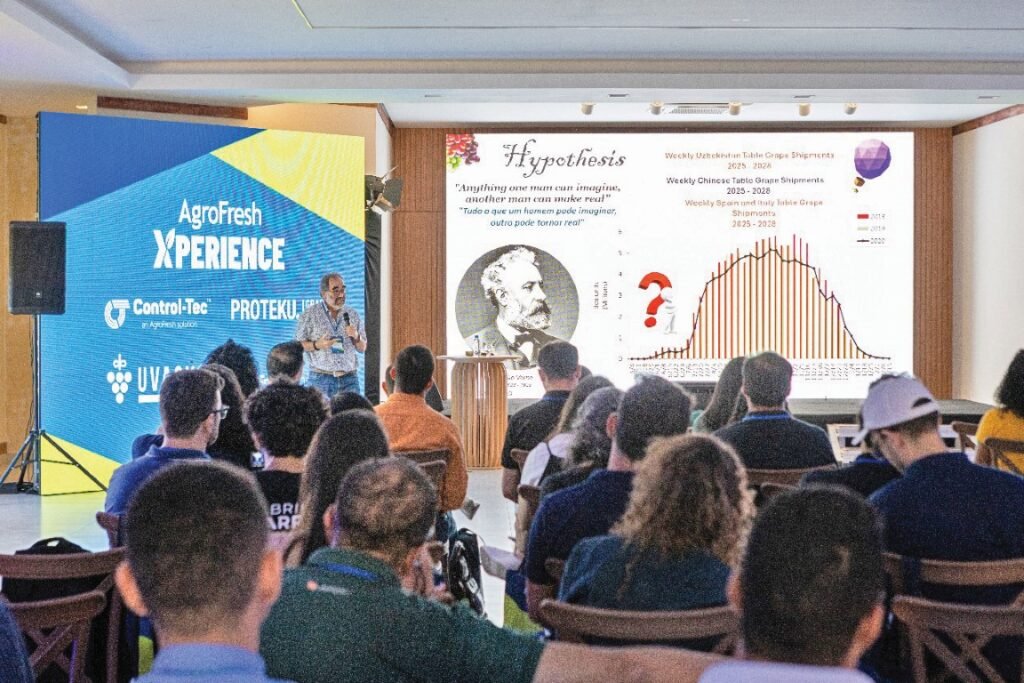 Oscar Salgado retornou ao palco para discutir desidratação versus escurecimento do engaço, e, para encerrar, Eduardo Rey, gerente regional da AgroFresh, apresentou as soluções integradas de Packing Line, destacando inovações que fortalecem a competitividade da cadeia de exportação de frutas.