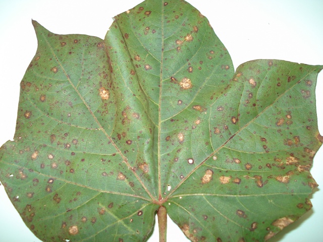 Os sintomas iniciais da mancha-alvo (Corynesporacassiicola) no algodoeiro ocorrem principalmente no período de fechamento das entrelinhas, apresentando pequenos pontos circulares de coloração arroxeada nas folhas. Com a evolução da doença, esses pontos tornam-se manchas de formato arredondado ou irregular, com bordas marrom escuro e centro marrom claro, variando em tamanho de 2 a 20 mm.