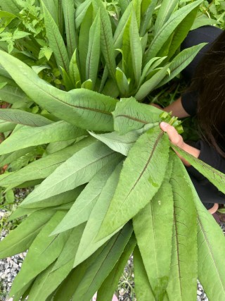 Quando envelhece, a planta emite uma haste floral que pode atingir até 2,0 metros de altura, e suas flores são do tipo margarida de miolo amarelo e pétalas bege pálido. As múltiplas sementes são pretas e dispersam-se pelo vento.