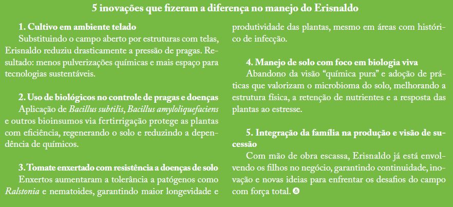 “Com o telado, a gente reduz muito a necessidade de aplicações. Isso favorece o uso de biológicos, que se desenvolvem melhor sem tanta interferência química”, explica Erisnaldo. A adoção de biológicos no controle de pragas e doenças foi uma virada de chave para a fazenda. O produtor aplica, por exemplo, Bacillus subtilis e Bacillus amyloliquefaciens via fertirrigação, além de usar o manejo de solo com foco em regeneração e equilíbrio microbiológico.