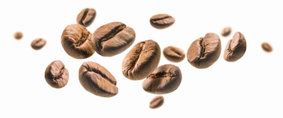 Coffee beans levitate on a white background