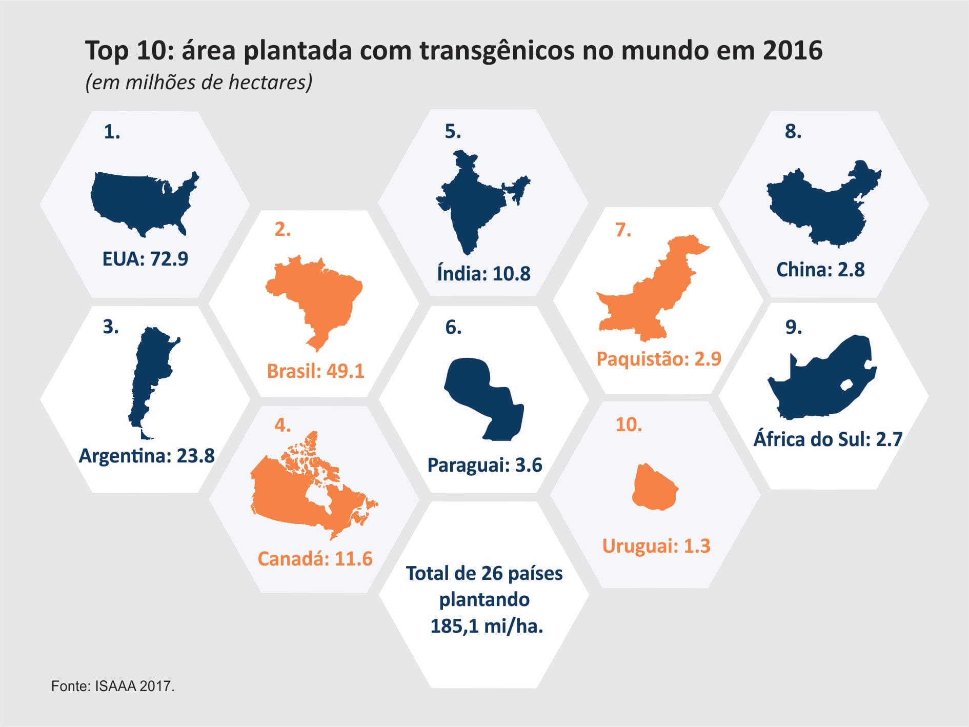 O Brasil cultivou 49,1 milhões de hectares com culturas transgênicas em 2016, um crescimento de 11% em relação a 2015, ou o equivalente a 4,9 milhões de hectares. Nenhum outro país do mundo apresentou um crescimento tão expressivo.