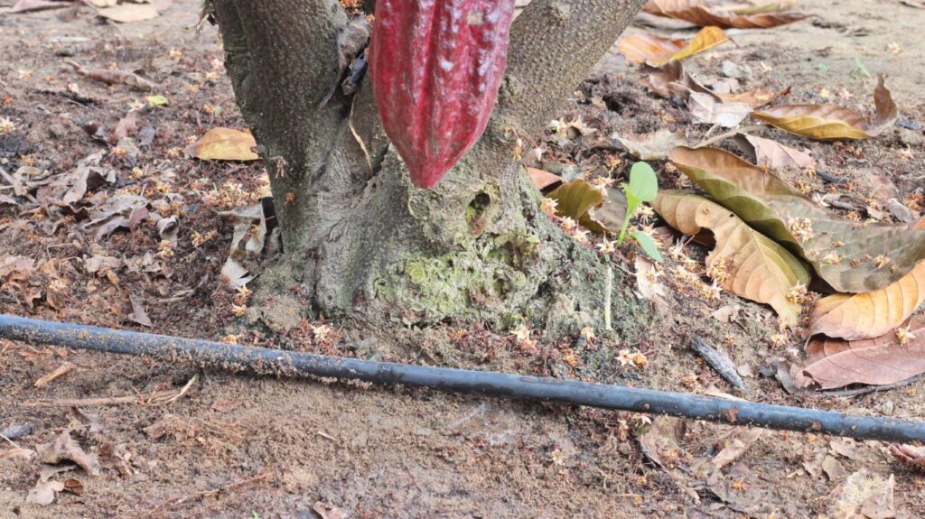A irrigação desponta como uma das grandes alavancas da cacauicultura moderna. Embora eleve o custo inicial, reduz o custo por tonelada, aumenta a regularidade da produção e melhora a qualidade das amêndoas.