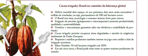 O cacau irrigado surge, assim, como vetor de produtividade, qualidade e sustentabilidade, reposicionando o Brasil no mapa mundial do chocolate e abrindo caminho para uma agricultura de futuro.