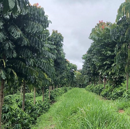 Em lavouras de café com mogno africano (árvores mais altas); os custos de produção são reduzidos, já que ambas aproveitam as aplicações dos mesmos insumos, como a adubação.