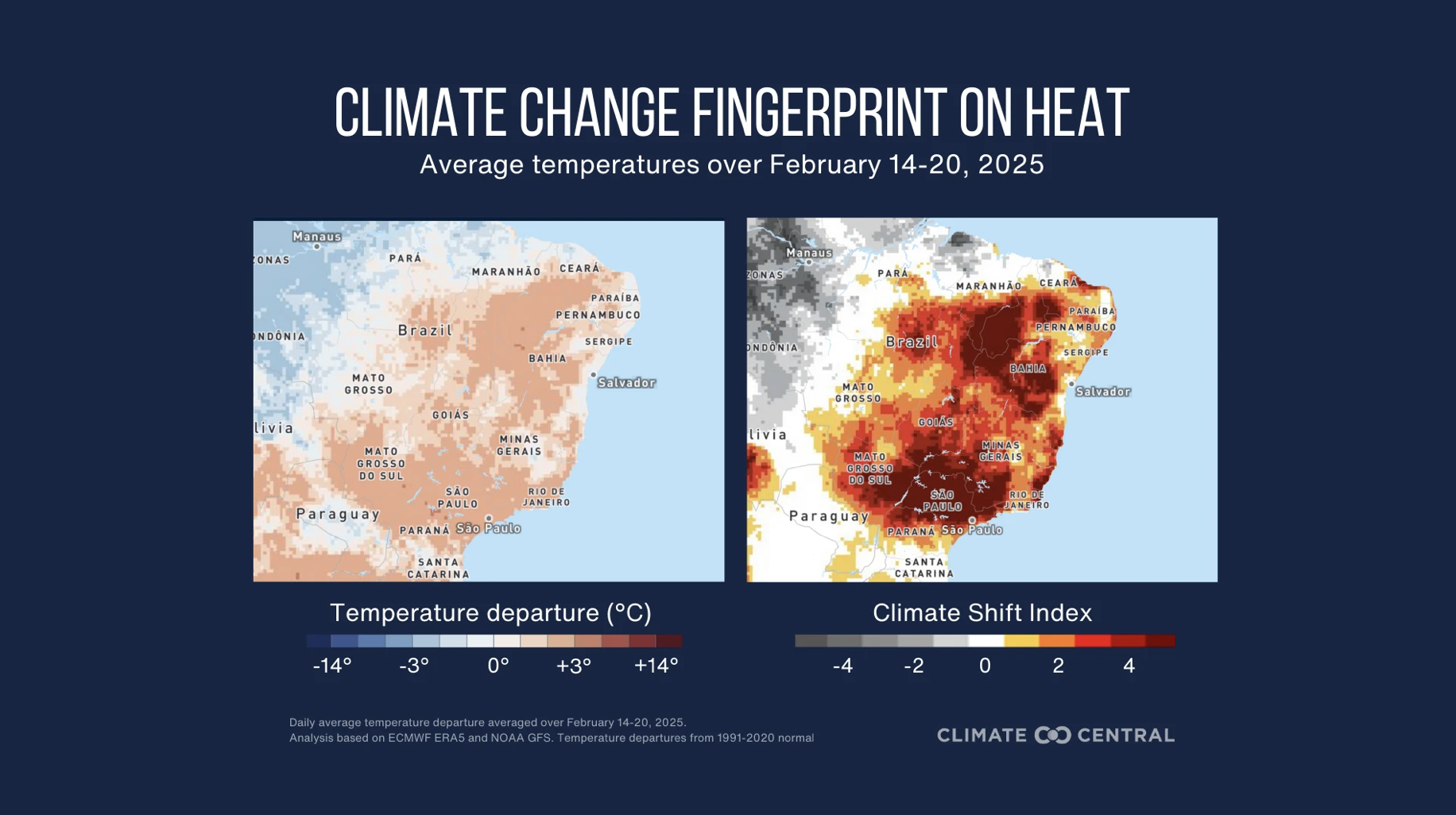 As temperaturas extremas, que variaram de 30°C a 44°C, foram consideravelmente mais altas do que o normal para esta época do ano. Entre 14 e 20 de fevereiro, algumas localidades no Brasil registraram variações de até 8°C acima da média histórica para o período. Cidades de diferentes regiões do país, como Nordeste, Sudeste e Sul, atingiram o nível 5 do Índice de Mudança Climática (ISC), que indica que as mudanças climáticas causadas pelo homem tornaram esse calor extremo pelo menos cinco vezes mais provável.