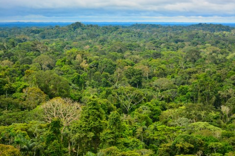 A birds eye view of the amazon region with lots of trees.