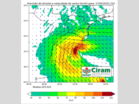 Ciclones são sistemas de baixa pressão nos quais os ventos giram em sentido horário no Hemisfério Sul e com forte intensidade nas áreas ao redor do seu centro. Na imagem abaixo pode ser observado o ciclone no mar de 17 de maio de 22, cujos ventos atingiram o litoral com grande intensidade. Alguns sistemas são mais intensos em relação a outros, com rajadas que podem chegar a 80km/h ou mais, especialmente em municípios do RS e da costa sul catarinense.