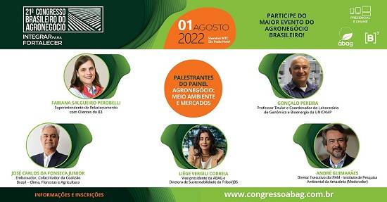 O 21º Congresso Brasileiro do Agronegócio acontece no dia 1º de agosto em São Paulo. A edição de 2022 apresentará uma análise sobre a sustentabilidade no agronegócio brasileiro, com o tema “Integrar para Fortalecer” e será realizada em formato híbrido. As inscrições para participar estão abertas em ambas opções, e para realizar, basta acessar o site oficial. (Veja programação completa do 21º Congresso Brasileiro do Agronegócio durante a matéria)