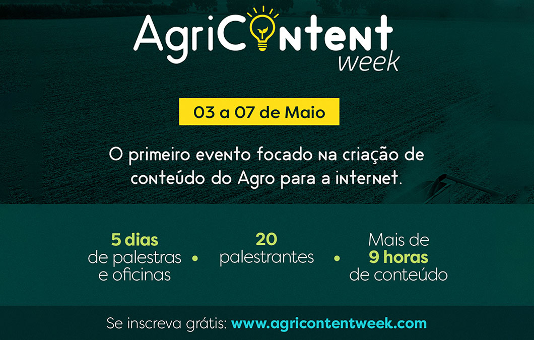 A AgriContent Week é direcionada para criadores de conteúdo e empresas do setor que querem se aproximar de influenciadores desse nicho. O evento é totalmente gratuito e será realizado de maneira virtual. Para participar, basta se inscrever até o dia 3 de maio, por meio do site: www.agricontentweek.com. As transmissões ocorrem das 19h às 22h. As inscrições são limitadas.
