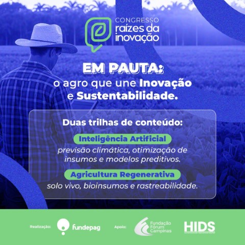 A Fundação de Desenvolvimento da Pesquisa do Agronegócio (Fundepag) promove, nos dias 2 e 3 de dezembro, o Congresso Raízes da Inovação, no Expo Dom Pedro, em Campinas (SP). O encontro reunirá representantes de empresas, indústrias, fundos de investimento, instituições de ciência, tecnologia e inovação, universidades, organizações multilaterais, além de gestores governamentais e do terceiro setor