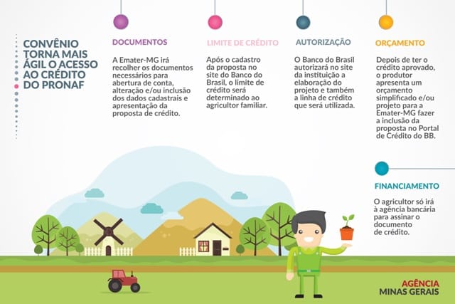O técnico da Emater-MG terá acesso ao sistema informatizado do Banco do Brasil para cadastrar o produtor rural e recolher os documentos necessários para obtenção de crédito. O Banco fará a análise dentro do próprio sistema. Serão destinados para a Agricultura Familiar R$ 2,7 bilhões.
