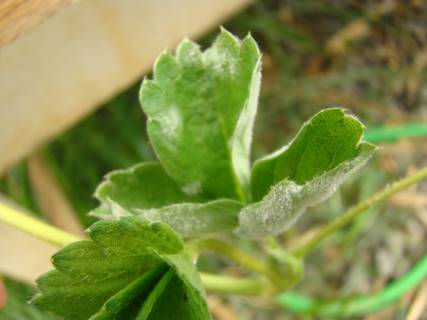 A doença é causada pelo fungo Sphaerotheca macularis. Seus sintomas iniciais surgem na parte inferior da folha como micélios brancos superficiais. Com o tempo, a massa de micélio toma conta da folha, que tende a curvar as bordas para cima.