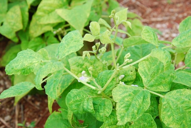 Para aparecer o mosaico dourado é preciso haver mosca-branca, e se o feijão for recém-germinado (6-7 dias do semeio) e houver o ataque da mosca, em cerca de 10 dias aparecem os primeiros sintomas, quando houver folhas verdadeiras ou trifoliadas. Logo, não se vê sintomas nas folhas cotiledonares ou primárias.