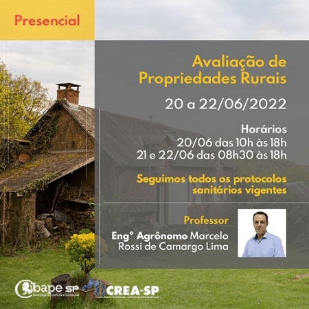 O Ibape ressalta que esta é a última oportunidade para conferir o curso “Avaliação de Propriedades Rurais” sob condução do professor Marcelo Rossi de Camargo Lima que atua no mercado há mais de trinta anos com engenharia de avaliações (este será o 196º curso que ele ministrará).