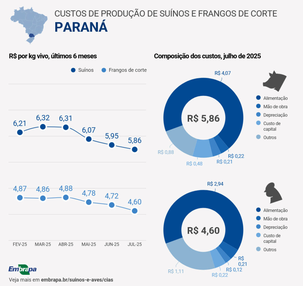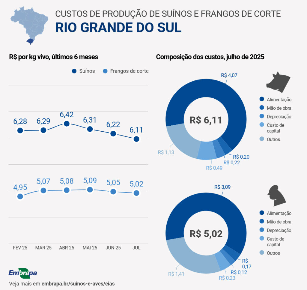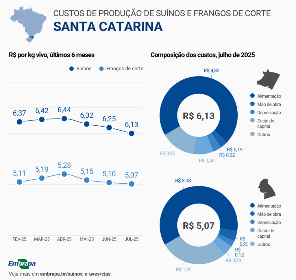 Os custos de produção de suínos e frangos de corte registraram queda pelo terceiro mês consecutivo em julho de 2025 nos principais estados produtores e exportadores do Brasil, segundo levantamento da Embrapa Suínos e Aves, por meio da Central de Inteligência de Aves e Suínos (CIAS).