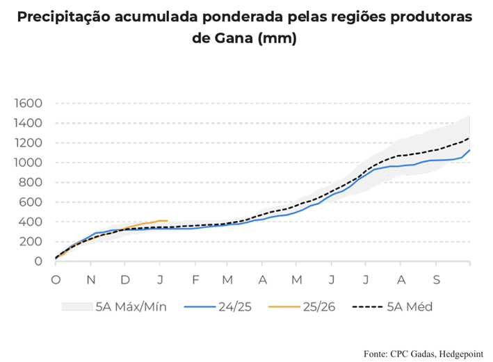 “Na faixa produtora de cacau da África Ocidental, principal região de origem das amêndoas, chuvas acima da média têm sido registradas nos últimos dias em áreas relevantes da Costa do Marfim e de Gana. O padrão contrasta com o observado no mesmo período da safra passada, quando essas regiões enfrentavam condições mais secas”, afirma Carolina França, analista da Hedgepoint Global Markets.