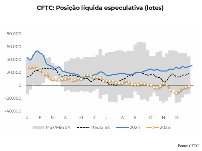 “De forma geral, o mercado segue à espera de novas informações relacionadas aos fundamentos. Nesse sentido, os fundos especulativos mantiveram posições praticamente estáveis em Nova York de acordo com o último relatório divulgado em 5 de janeiro, em níveis ainda abaixo da média e do mesmo período correspondente ao ano anterior, cenário que reflete tanto a cautela dos participantes quanto a redução da atividade observada durante o período de feriados de fim de ano”, complementa.