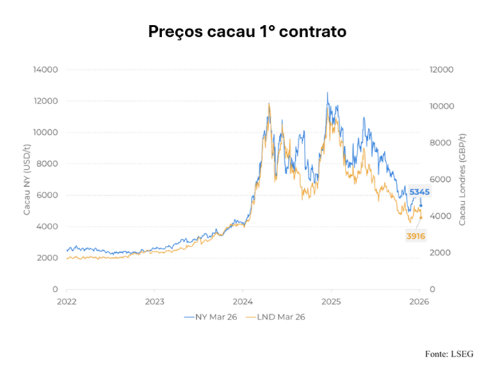 Os futuros do cacau encerraram a primeira semana de 2026 no dia 09 de janeiro cotados a 5.345 USD/t em Nova York e 3.916 GBP/t em Londres, acumulando perdas semanais de 8,96% e 7,81%, respectivamente, revertendo os ganhos da sessão anterior. De acordo com relatório da Hedgepoint Global Markets, sem mudanças significativas nos fundamentos, os principais vetores dos movimentos recentes permanecem associados ao clima e a fatores técnicos.