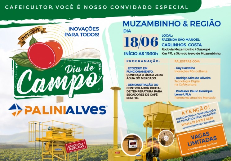 Seguindo sua tradição de Dias de Campo impactantes para o mercado, a Palinialves convida cafeicultores de Muzambinho & Região para, na próxima terça-feira, dia 18/06, conhecerem seu CONTROLADOR DIGITAL DE TEMPERATURA para secadores de café sem fio, EM FUNCIONAMENTO, e o DESPOLPADOR ECOZERO, único no mercado que realmente não consome água no processo de despolpa do café.