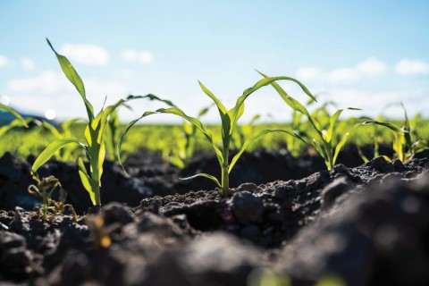 Fresh green sprouts of maize in spring on the field, soft focus. Growing young green corn seedling sprouts in cultivated agricultural farm field. Agricultural scene with corn's sprouts in soil.