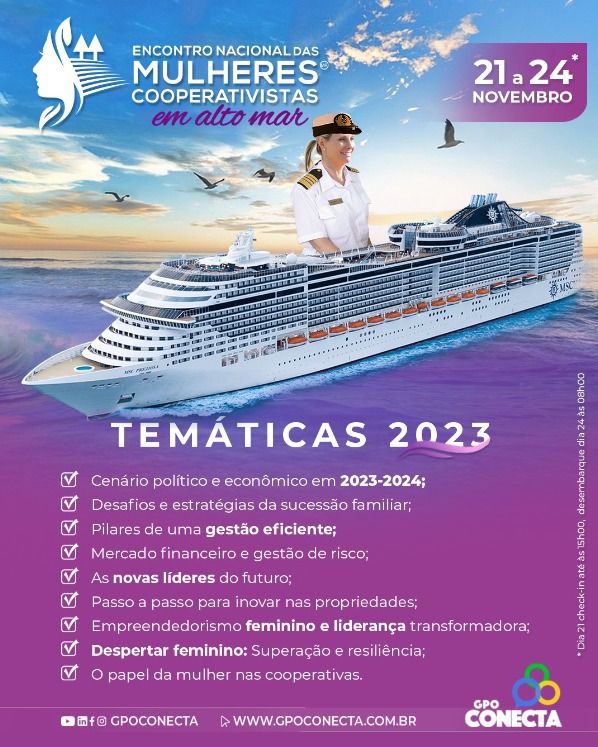 Centenas de produtoras rurais e especialistas em várias áreas de atuação estão confirmados para o encontro e no centro das discussões estarão estratégias de sucessão familiar, liderança e empreendedorismo, inovação no campo, comunicação e temas voltados para o universo feminino, como o Agro Fashion, um desfile de moda em alto mar, e o lançamento do livro “O chamado de um Propósito”, de Luciana Martins.