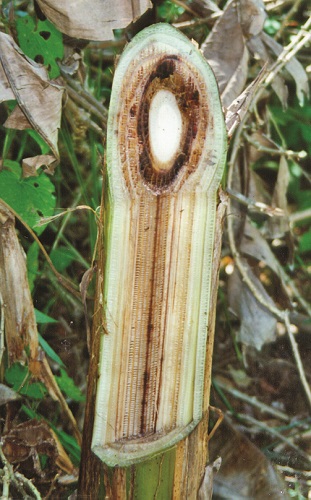 • Em corte transversal do pseudocaule, observa-se uma coloração pardo-avermelhada nos vasos do xilema, em forma de pontos na área periférica das bainhas, na maioria dos casos com área central sem sintomas;