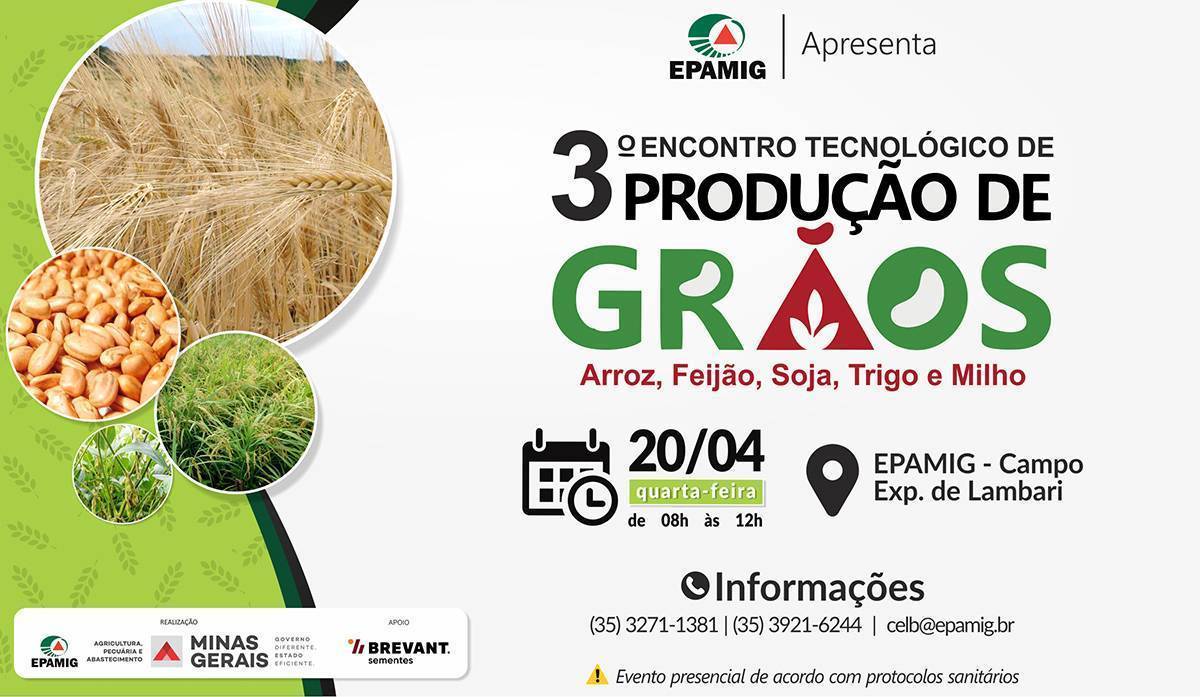 A Empresa de Pesquisa Agropecuária de Minas Gerais (EPAMIG) vai realizar o 3º Encontro Tecnológico de Produção de Grãos. O evento, presencial e gratuito, vai ocorrer no dia 20 de abril, de 8h às 12h, no Campo Experimental da EPAMIG de Lambari (MG). As inscrições serão realizadas no dia e no local do evento.