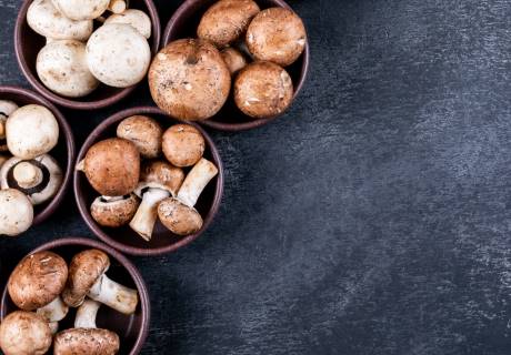 White and brown mushrooms in a lot of bowls on a dark background. top view. space for text