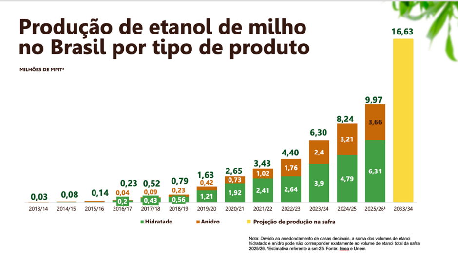 A produção nacional de etanol de milho cresceu mais de 1.500% em menos de uma década. Entre 2017 e a safra 2024/25, o salto foi de 520 milhões para 8,2 bilhões de litros, e a previsão para 2025/26 é ultrapassar 10 bilhões de litros, representando mais de 25% do etanol brasileiro.