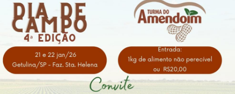 A Turma do Amendoim tem o prazer de convidar você para o Dia de Campo – 4ª Edição, um encontro técnico dedicado à troca de conhecimento, atualização e fortalecimento da cadeia produtiva do amendoim.
