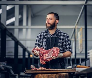 Portrait of a bearded meat man dressed in a fleece shirt holds fresh cut meat in a market.