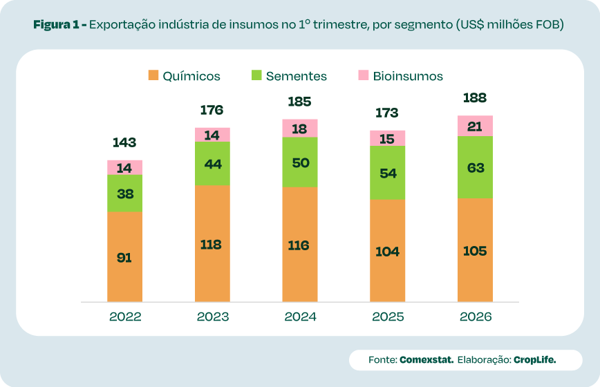As exportações brasileiras de insumos agrícolas – defensivos químicos, bioinsumos e sementes – somaram US$ 188 milhões no 1º trimestre de 2026, recorde no período. Em volume, foram embarcadas cerca de 40 mil toneladas de produtos. O valor representa um crescimento de 7,4% em relação ao mesmo período do ano passado e reflete o avanço da inserção internacional do setor. As sementes agrícolas atingiram US$ 63 milhões, um terço do total das vendas externa, melhor resultado para os três primeiros meses do ano. O destaque reforça a trajetória observada nos últimos cinco anos. O balanço é destaque da nota de abril do CropData, portal de dados da CropLife Brasil.