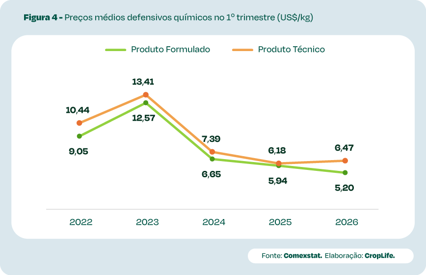 Sob outra perspectiva, as importações de defensivos químicos somaram US$ 2,3 bilhões, queda de 11% em relação ao primeiro trimestre de 2025. A retração foi observada em todos os segmentos — produtos formulados, técnicos e matérias-primas — e acompanhada por redução de 8% no volume importado. Esse movimento, já notado anteriormente, reflete, entre outros fatores, a maior participação de produtos genéricos nas compras externas, contribuindo para a queda dos preços médios.