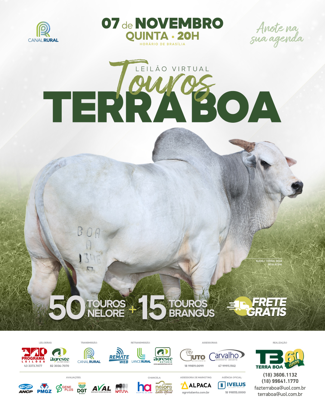 No dia 07 de novembro será realizado o Leilão Virtual Touros Terra Boa, com início marcado para às 20 horas (horário de Brasília) e transmissão pelo Canal Rural. Serão ofertados 50 touros Nelore e 15 touros Brangus no dia do evento.