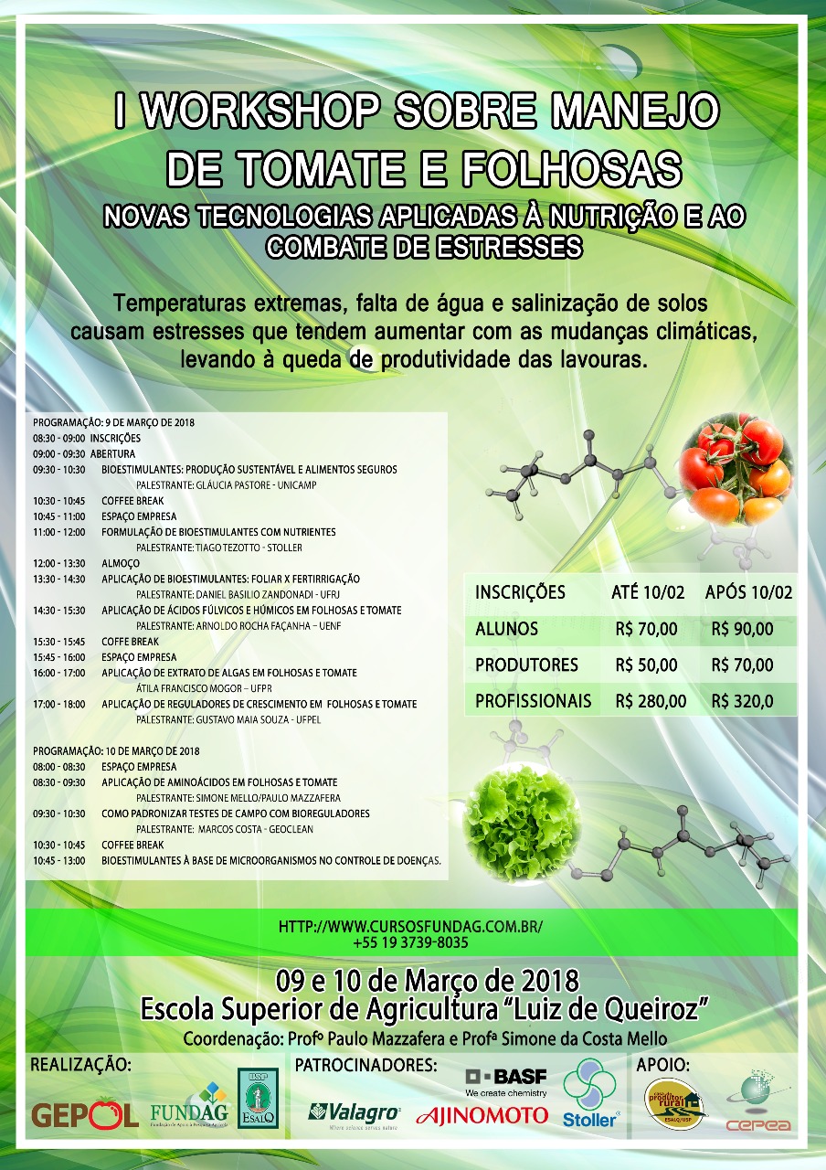 Informações e inscrições em http://fundag.br/novo/i-workshop-sobre-manejo-de-tomate-e-folhosas/ .