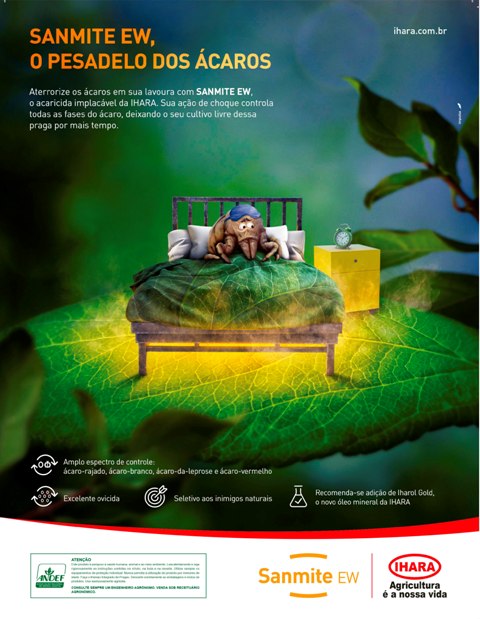 Com um dos portfólios mais completos do mercado, a IHARA, especializada em tecnologia para proteção de cultivos, continua utilizando sua expertise em pesquisa e desenvolvimento para oferecer novos produtos ao campo. Entre seus mais recentes lançamentos está o SANMITE EW, acaricida com alto efeito de choque, amplo espectro de ação e eficiência observada em todas as fases de desenvolvimento do ácaro.
