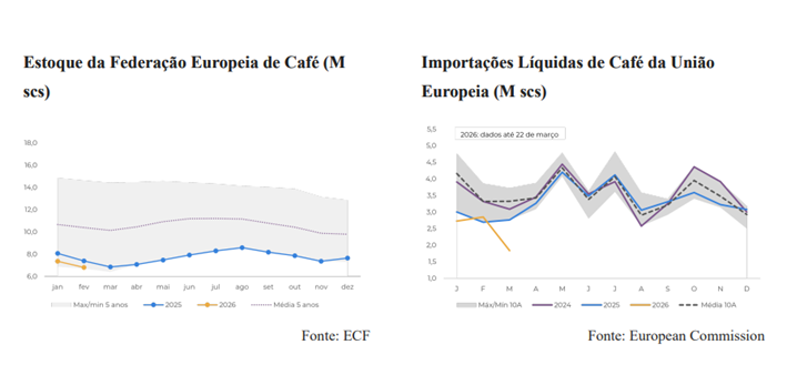 Os estoques de café da Federação Europeia de Café (ECF) recuaram nos dois primeiros meses de 2026, atingindo o nível mais baixo desde março de 2024, em um cenário marcado por importações líquidas mais fracas, restrições de oferta nas origens, sinais de enfraquecimento da demanda no bloco europeu e custos financeiros para formação de estoques ainda elevados.