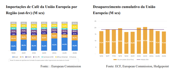 De um lado, os custos financeiros seguem elevados, devido ao mercado futuro invertido (com os contratos de menor vencimento mais caros que os de longo prazo) e taxas de juros ainda em patamares mais altos, o que desestimula a formação de estoques em destinos. Do outro, cafeicultores, mais capitalizados devido aos altos preços das últimas safras, seguem segurando parte de sua mercadoria. Especialmente no Brasil (maior produtor de café do mundo), produtores passaram a reter uma parcela maior da safra 2025/26, reduzindo o ritmo de exportações e contribuindo para a menor participação do país no abastecimento europeu.