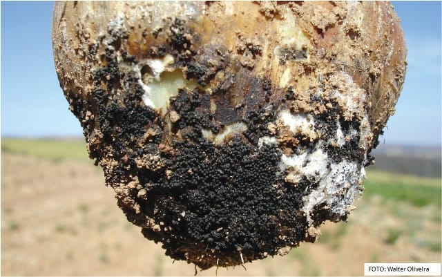 O inóculo de S. cepivorum foi obtido a partir de micélio e escleródios em placas de Petri contendo meio de cultura BDA (Batata-Dextrose-Ágar) preservado em geladeira (±4°C). Discos de micélio com 09 mm de diâmetro foram removidos dessas placas e inoculados no centro de placas de Petri com 8 cm de diâmetro contendo uma fina camada de meio de cultura BDA e incubados em câmera de germinação do tipo B.O.D. (Demanda Biológica de Oxigênio) a uma temperatura de 18°C e fotoperíodo de 12 horas durante seis dias para crescimento do micélio.