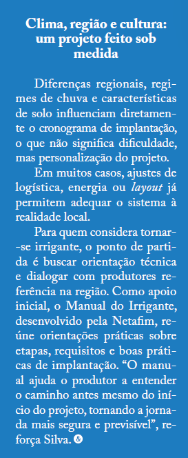 Segundo Danilo Silva, gerente agronômico da Netafim, a irrigação deve ser considerada ainda nas primeiras discussões sobre a abertura de uma nova área ou na reorganização do sistema produtivo. “Quando o produtor antecipa a decisão, ele consegue organizar licenças, infraestrutura e análise hídrica com tranquilidade, evitando correrias perto do plantio e tornando todo o processo mais simples e eficiente”, afirma.