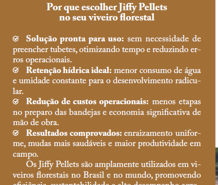 A produção de mudas florestais exige soluções que unam qualidade, praticidade e responsabilidade ambiental. Nesse cenário, os Jiffy Pellets se consolidam como uma alternativa moderna e eficiente para viveiros que buscam alto desempenho com menor impacto ambiental e custo operacional reduzido.