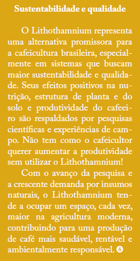 O uso do Lithothamnium na cultura do café tem mostrado resultados promissores, tanto na fase de mudas quanto no desenvolvimento em campo, contribuindo para a melhoria da estrutura do solo, nutrição das plantas e aumento da produtividade.