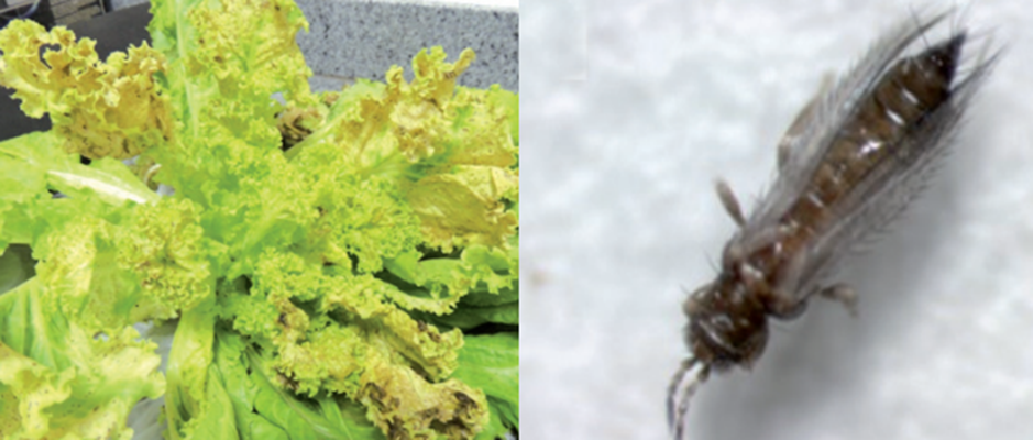 Uma das principais pragas enfrentadas por produtores de hidroponia de alface atualmente é o tripes. Esse inseto pode causar danos diretos como pequenas lesões prateadas nas folhas, resultado de danos ocasionados no momento da alimentação de adultos e larvas, o que no momento da colheita reflete numa planta de menor volume devido ao descarte dessas folhas. Entretanto, o principal dano causado é o efeito indireto, através da transmissão de uma virose popularmente conhecida como “vira-cabeça” (causado por espécies do gênero Tospovírus). Por ser feito em sua maioria em ambientes protegidos, em estufas de cobertura plástica, as hidroponias se tornam ambientes mais secos, e isso aliado a temperaturas mais altas favorecem a reprodução dessa praga.