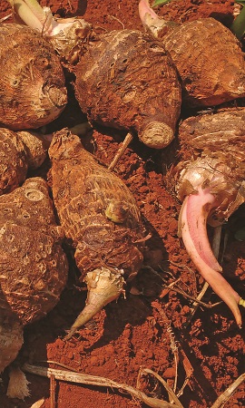 O inhame (Dioscorea cayenensis), uma cultura originária da Ásia e África, é um tubérculo com formato irregular e tamanho variado, com polpa esbranquiçada, fibrosa e comestível, casca rugosa com coloração variando do esbranquiçado ao castanho escuro.