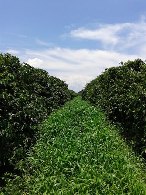 Não é qualquer mato que devemos cultivar no meio das entrelinhas. Várias são as opções. A que tem dado excelentes resultados é a Braquiariaruziziensis, por ter características especiais únicas, como: uma só florada por ano, sistema radicular bem desenvolvido, gramatenra, ou seja, não deixa espaço para o crescimento de outras plantas quando manejada manual ou mecanicamente, requer baixa dose de herbicida para ser controlada, alelopatia, inibindo o surgimento de ervas daninhas, alta relação C:N de 40 a 50:1 e bom teor de fibras que, ao se decompor, eleva o teor de matéria orgânica do solo.  É uma planta incomparável, sem similar nos dias atuais.