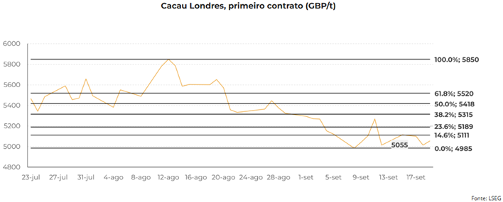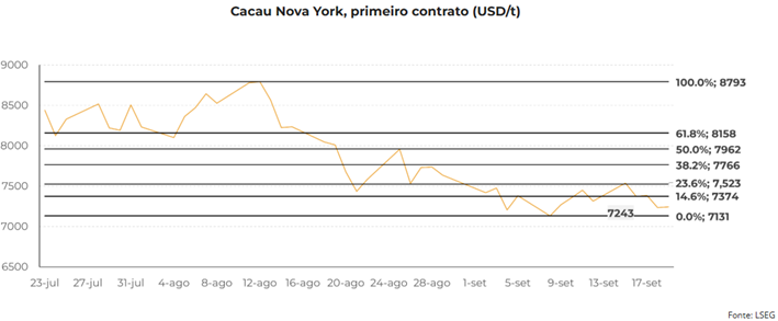 Após oscilações, os futuros de cacau encerraram a semana de 19 de setembro próximos aos níveis da semana anterior. Em Nova York, o contrato de dezembro/25 fechou a 7.243 USD/t e, em Londres, a 5.055 GBP/t. Em ambos os mercados, os fechamentos ficaram acima de seus respectivos níveis de suporte, e novas oscilações seguem no radar enquanto o mercado aguarda novas informações, dada a proximidade da safra que começa em outubro. Diante desse quadro, a atenção se volta aos fatores que podem influenciar os preços nas próximas semanas.